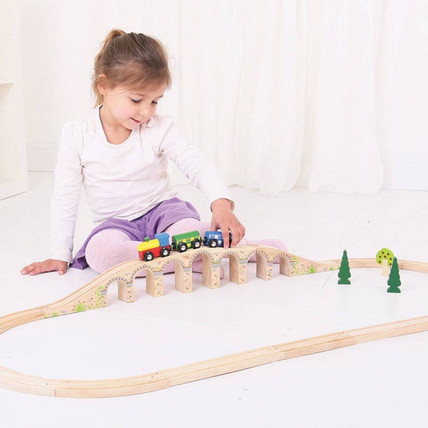 Kinderen kunnen treinen laten rijden over, onder en rond het viaduct — dit zorgt voor een rijker spel en meer creatieve mogelijkheden.