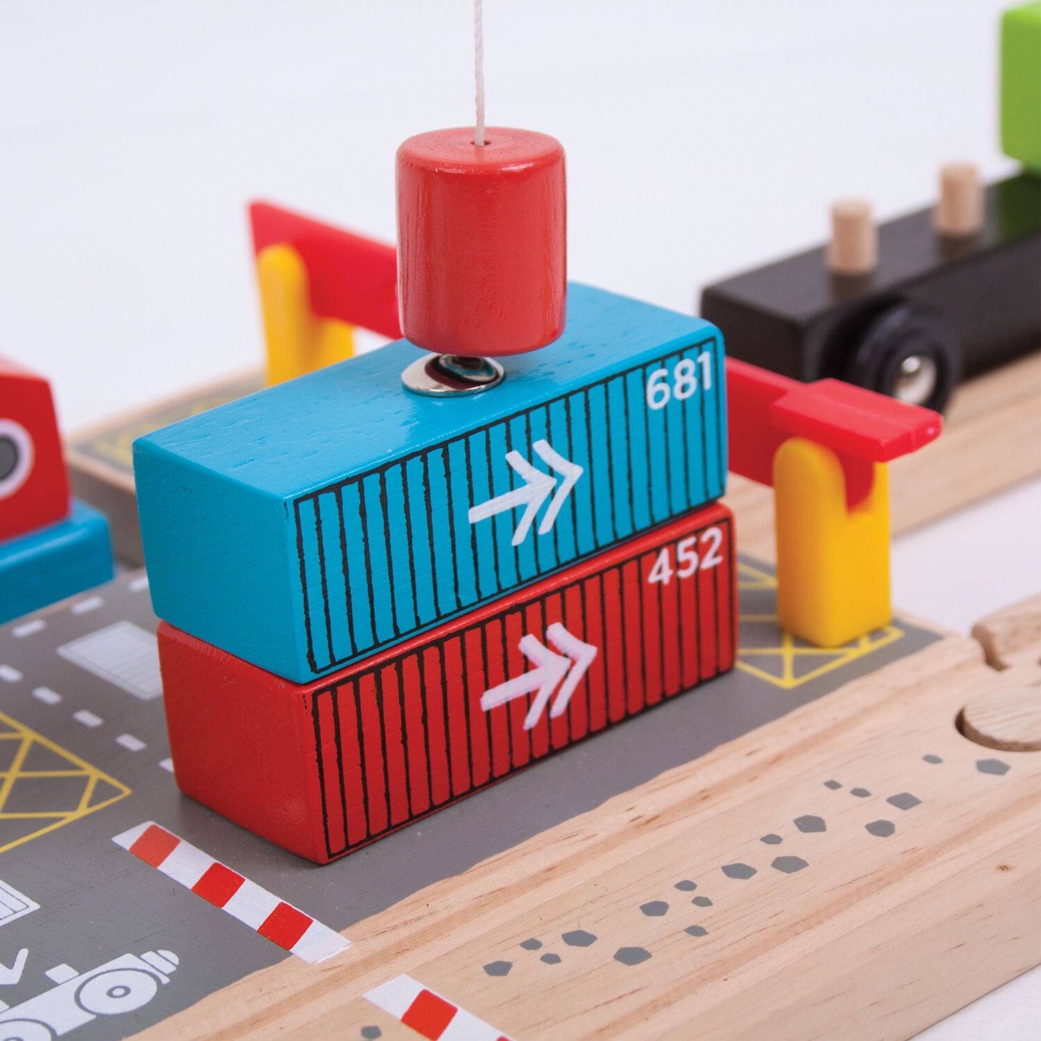 Dankzij het houten materiaal past de container-scheepswerf mooi bij andere houten treinen, rails en accessoires in je collectie.
